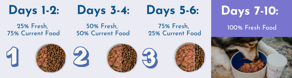 - Days 1–2: Replace 25% of the current meal with fresh food