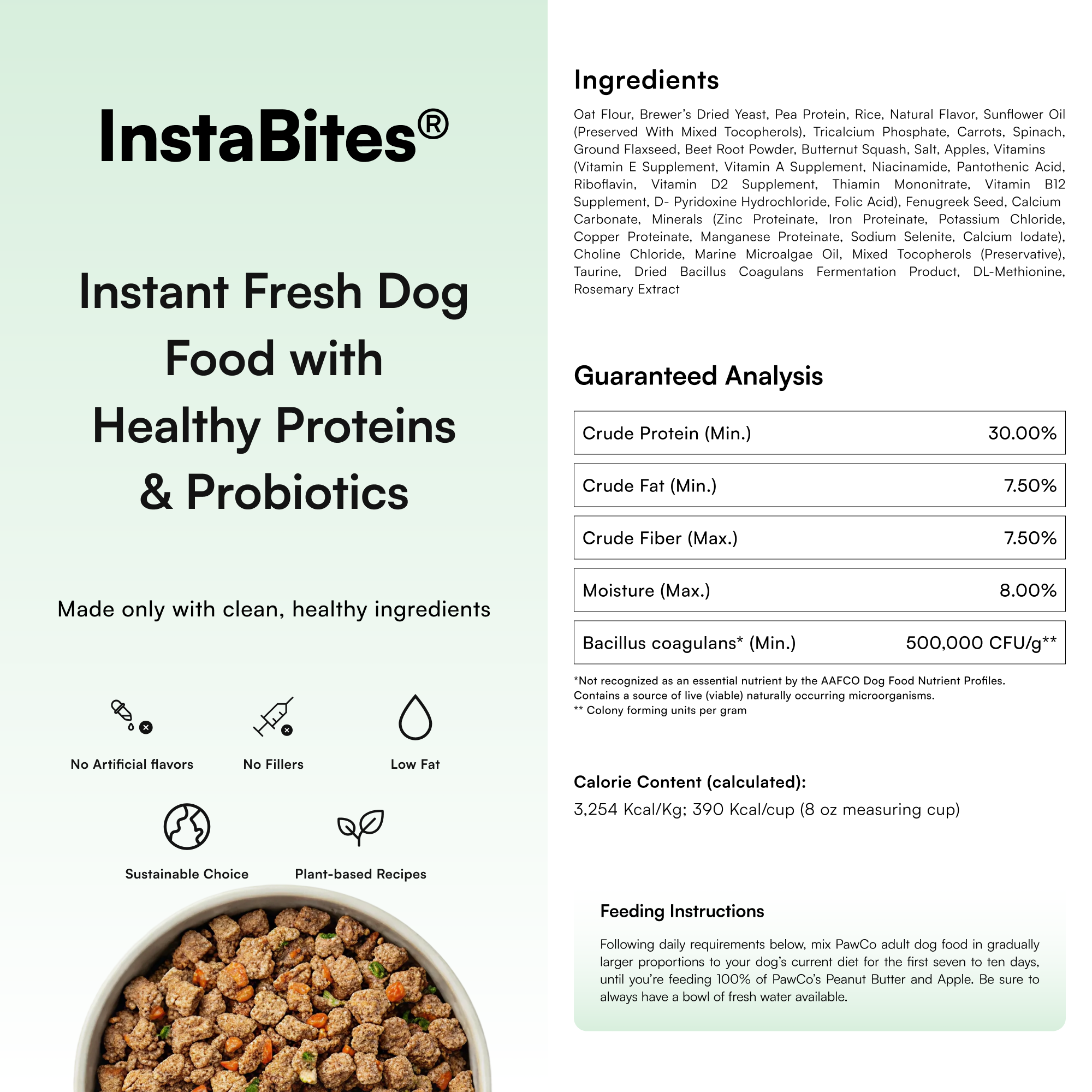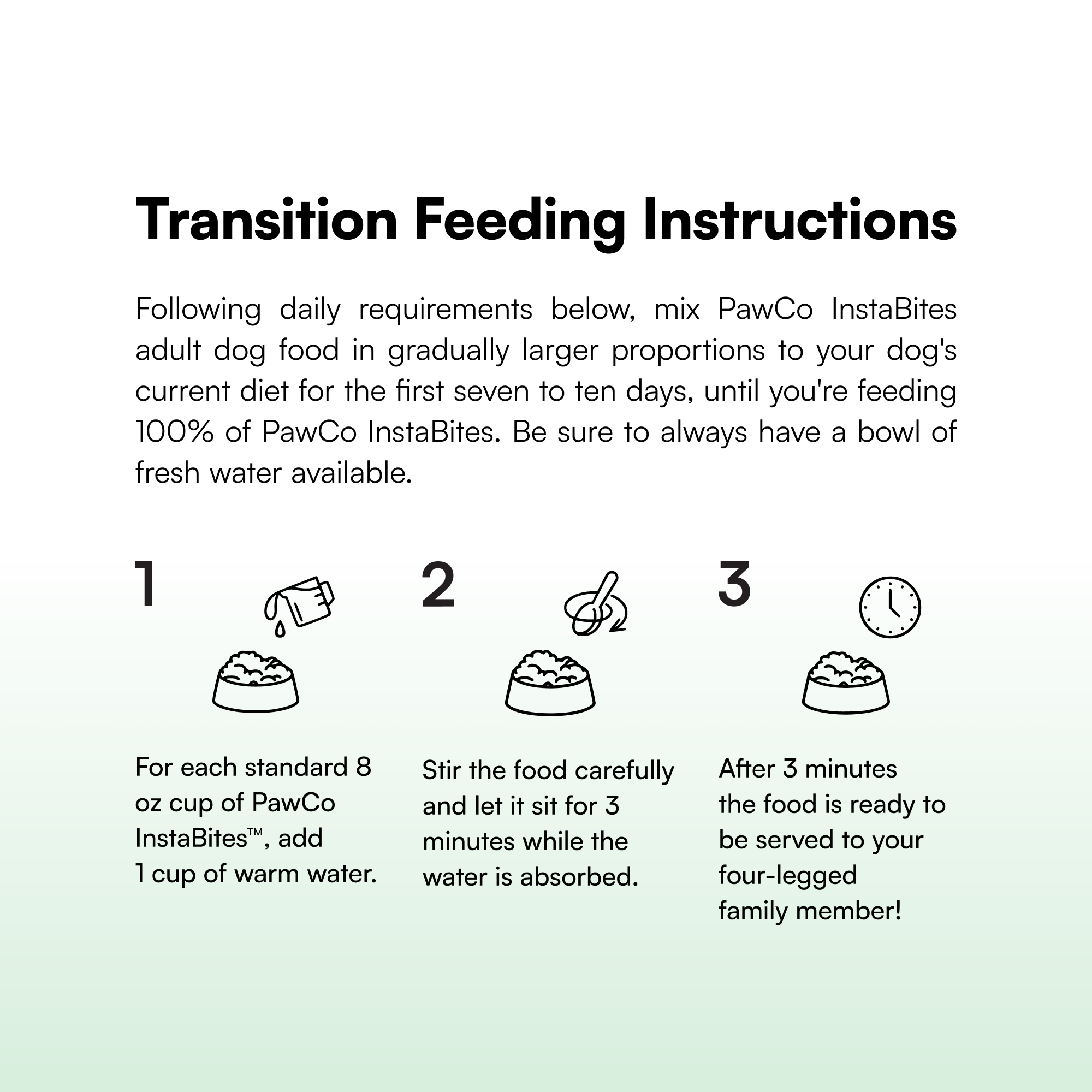 For every 1⁄4 cup of PawCo InstaBites, add 3 Tablespoons of warm water. Stir and wait 5 minutes before serving.