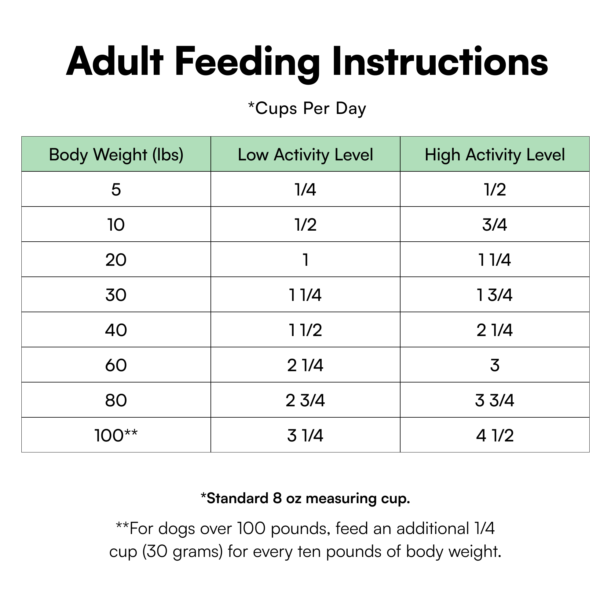 **For dogs over 100 pounds, feed an additional 1/4 cup (30 grams) for every ten pounds of body weight.
