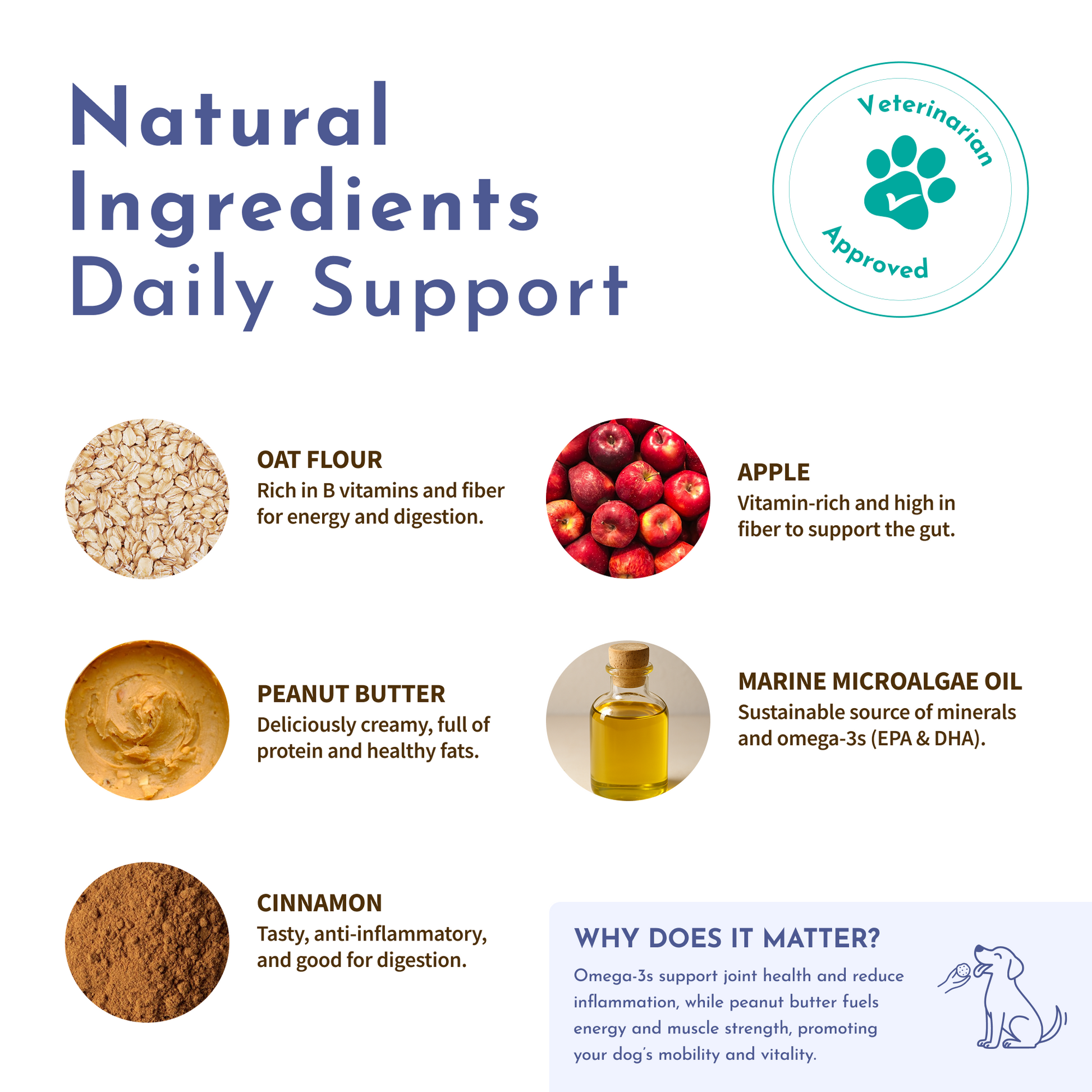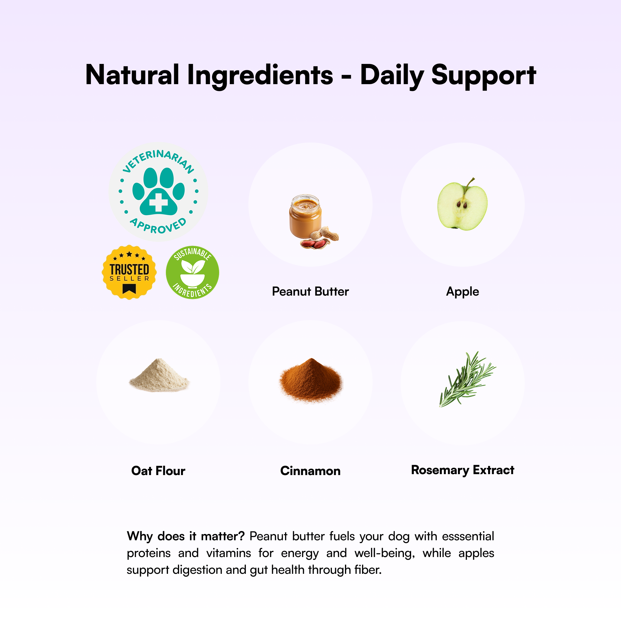 Oat Flour, Peanut Butter, Apples, Marine Microalgae Oil (Source of Omega-3 Fatty Acids), Mixed Tocopherols (Natural Preservative), Cinnamon, Rosemary Extract