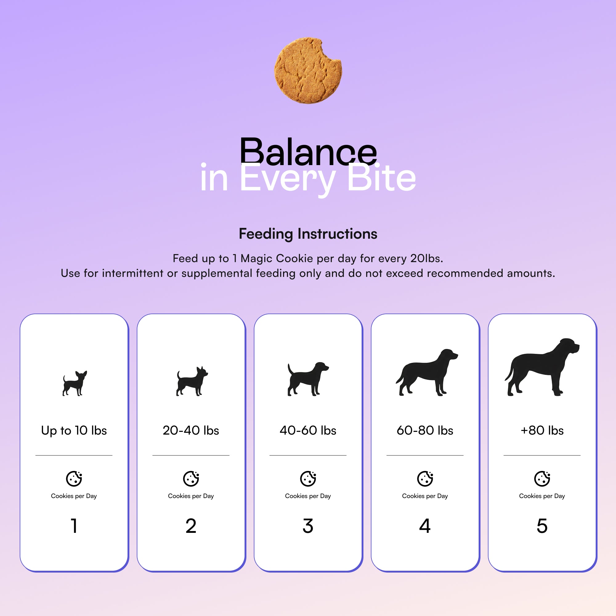 Feed up to 1 Magic Cookie per day for every 20lbs. Use for intermittent or supplemental feeding only and do not exceed recommended amounts.