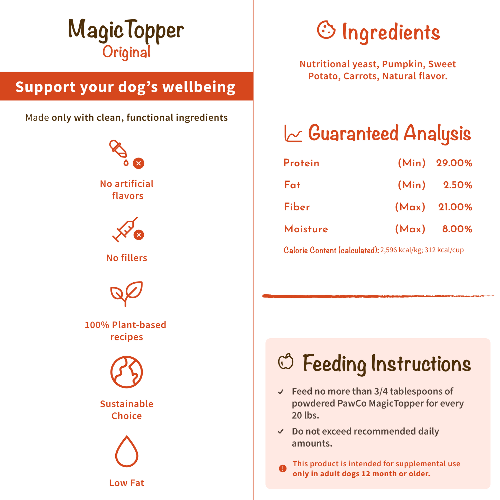 - Do not feed more than 3/4 tablespoons of powdered PawCo MagicTopper for every 20 lbs.