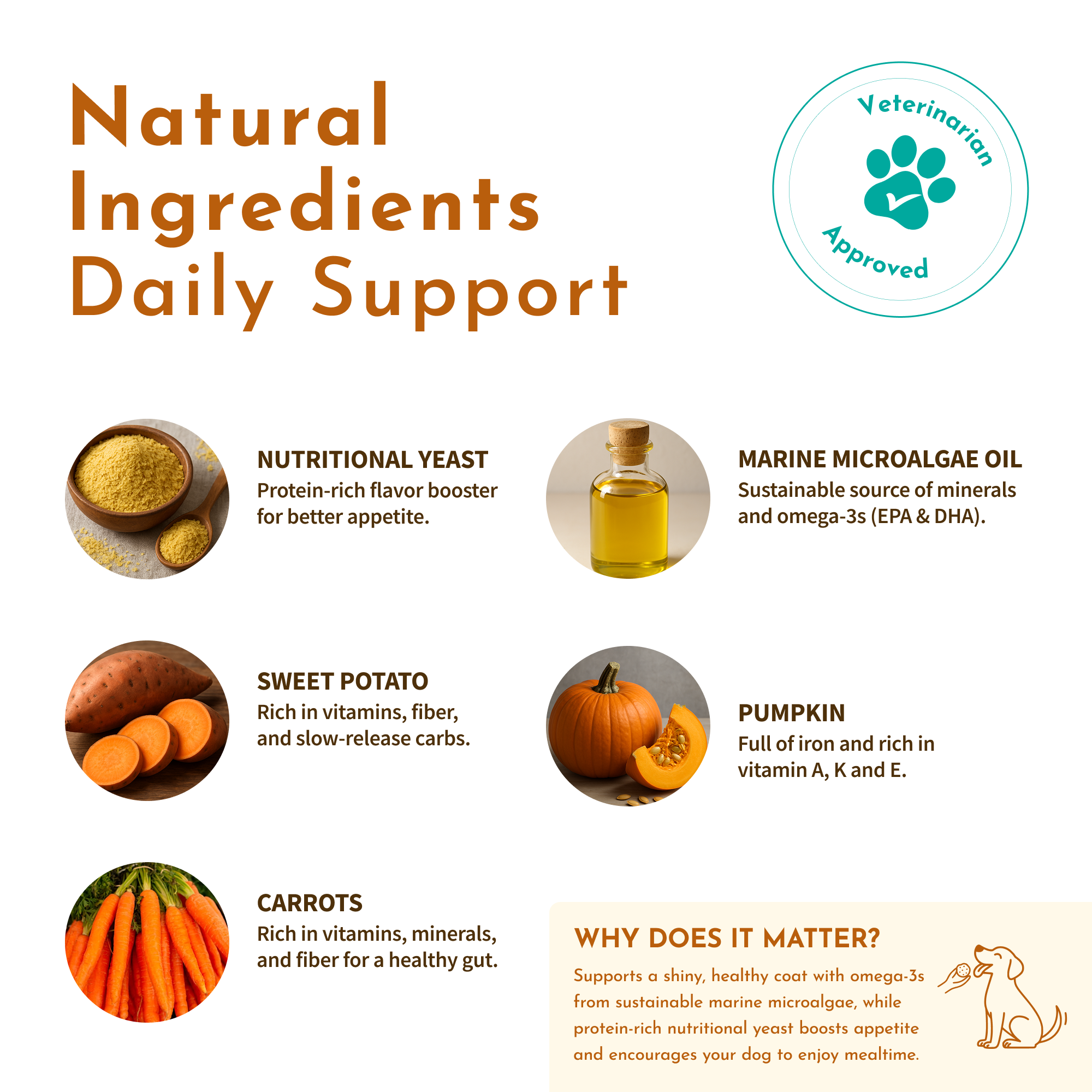 Nutritional Yeast, Carrot, Pumpkin, Sweet Potato, Marine Microalgae (Source of Omega-3 Fatty Acids), Natural Flavor