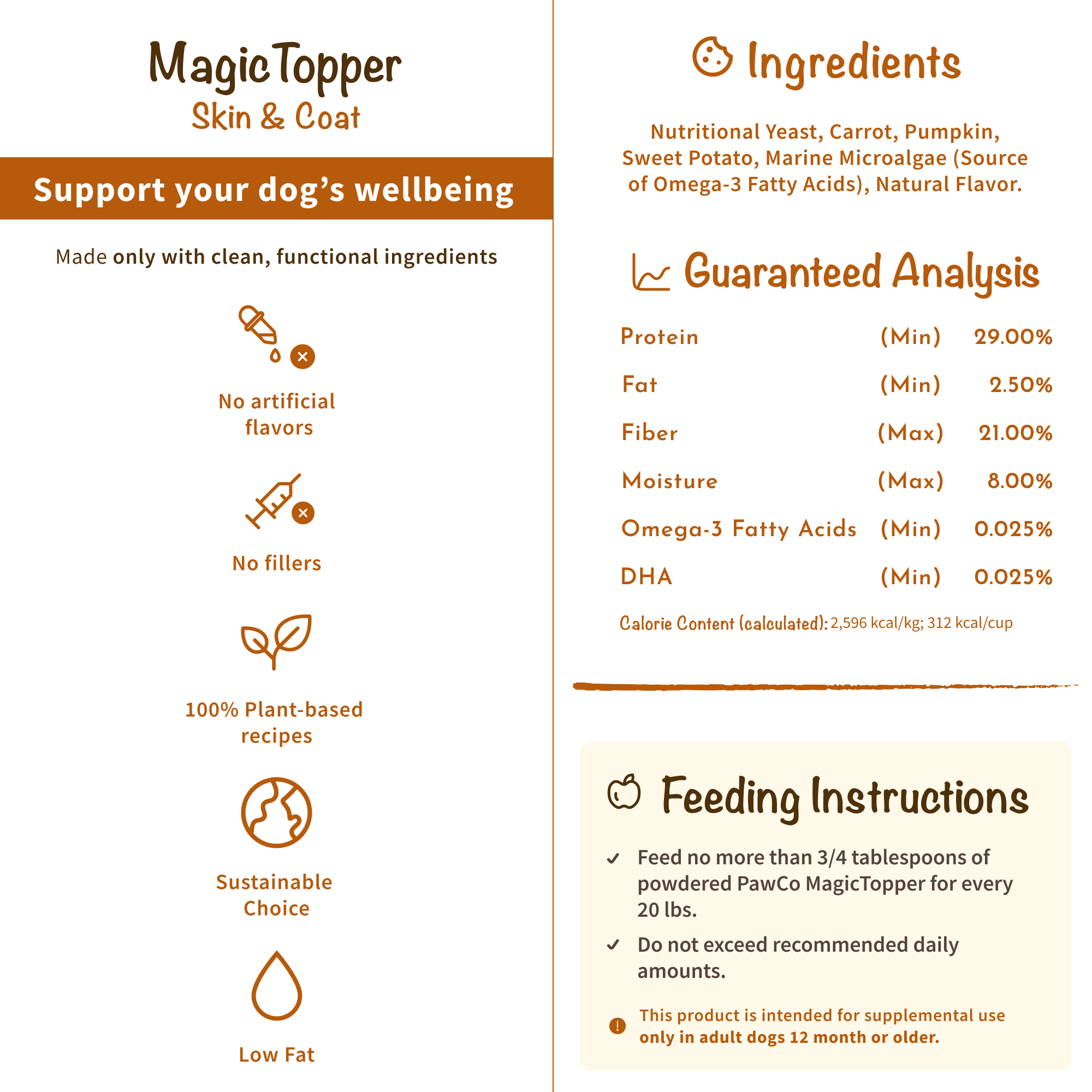 - Do not feed more than 3/4 tablespoons of powdered PawCo MagicTopper for every 20 lbs.