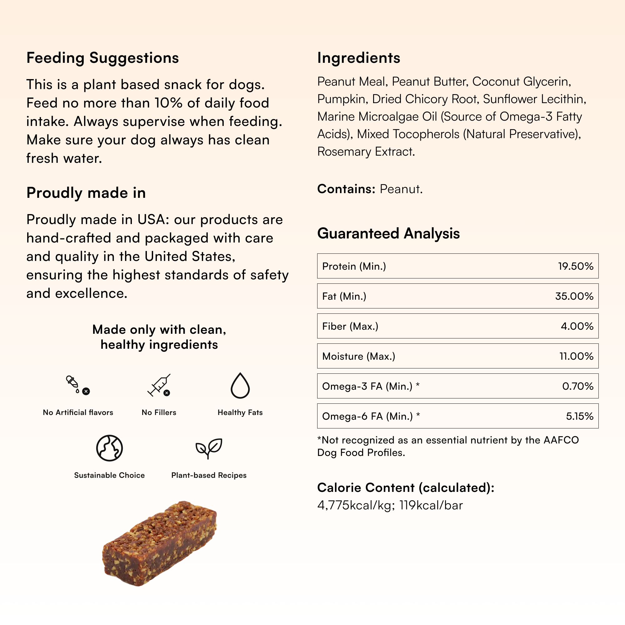 Peanut Meal, Peanut Butter, Coconut Glycerin, Pumpkin, Dried Chicory Root, Sunflower Lecithin, Marine Microalgae Oil (Source of Omega - 3 Fatty Acids), Mixed Tocopherols (Natural Preservative), Rosemary Extract.