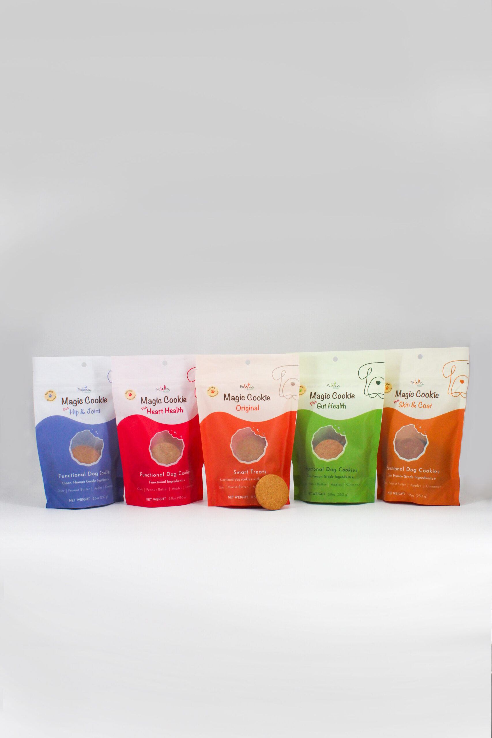 5 Magic Cookies packs— baked with oats, peanut butter, apples & cinnamon plus targeted functional nutrients. All flavors included to support your pup’s daily wellness.