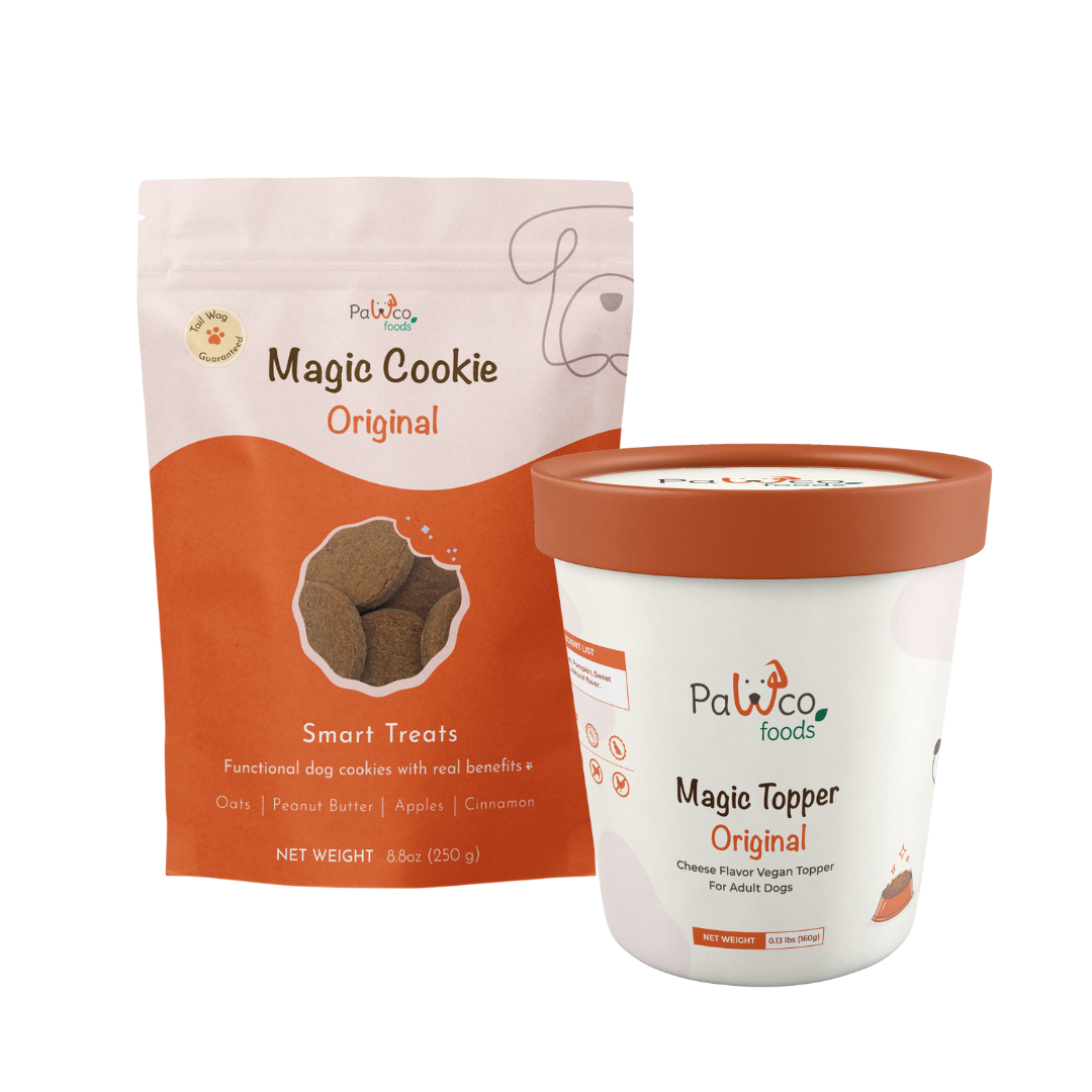 This box includes all our Fresh Recipes, our Shelf-Stable Recipe, plus 1 Magic Topper, & 1 Magic Cookie — The perfect way to explore PawCo meals, toppers & treats and discover your pup’s favorites.